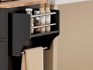 - 🎁[𝐌𝐮𝐥𝐭𝐢𝐩𝐮𝐫𝐩𝐨𝐬𝐞 𝐬𝐭𝐨𝐫𝐚𝐠𝐞]The kitchen cart has a convenient slide-out drawer under the top, allowing you to store small items such as keys, chopsticks, and spoons. It also features a storage cabinet with 2 doors at the bottom, a spice rack, and a towel bar, providing ample space for your kitchen essentials.